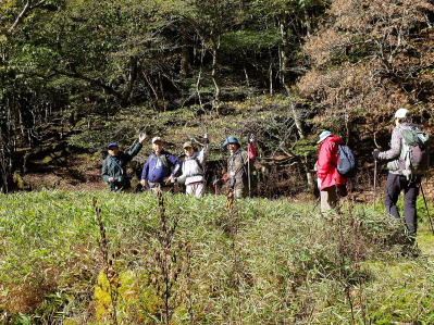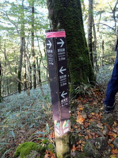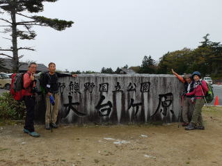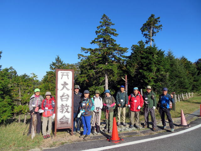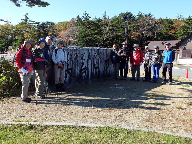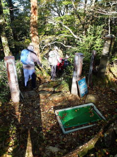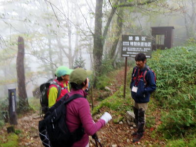 朝、外の天気は良いが風が吹き寒い。朝食を済まし上着を着て外に出る。半袖は無理。寒いし風も強い。 駐車場の車前に集合し、駐車場入り口と西大台ケ原登山口で写真を撮り8時20分出発。 歩き始めは雲一つない快晴、軽い下りで歩きやすい笹道を行く。 大台教会の建物の手前を左の方へ、少し歩くと小さな小屋がありそこで立入認定証の確認があり(チェックポイントで認定番号と名前の確認)そして、入る前にマットで靴底の泥を落として入る。石がゴロゴロした下り。すぐに分岐に着く。