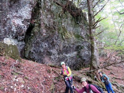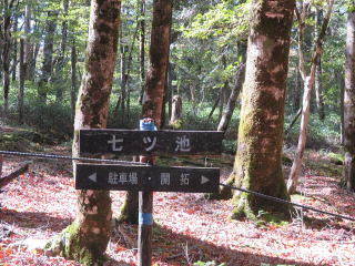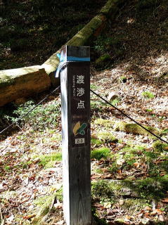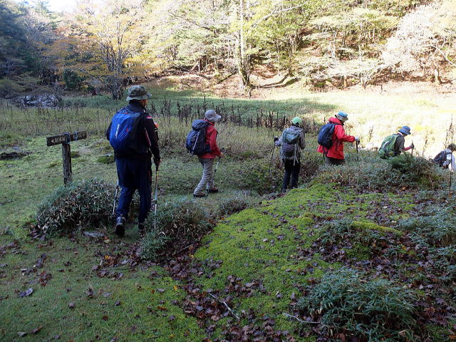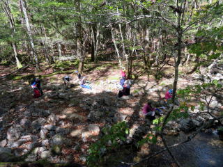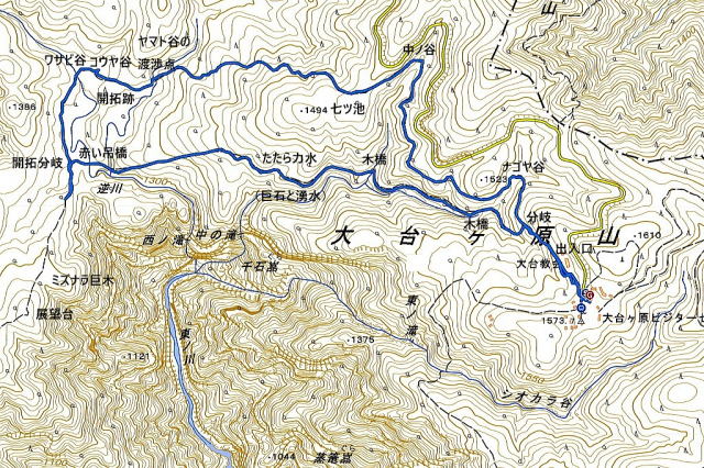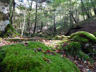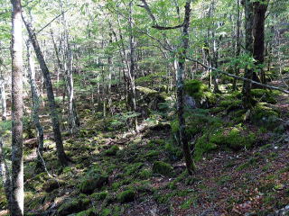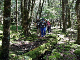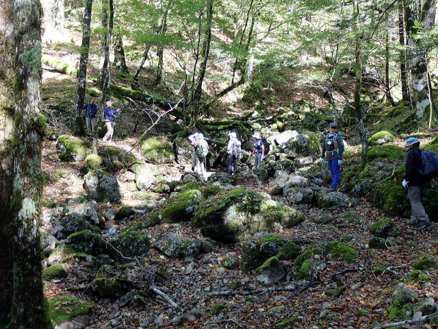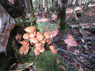 西大台は周回コースで、反時計回りで行く。更に下り道で、歩き続けていくと苔が石や木々にも苔がびっしりと付いている。 キノコが無数に生えている木も見ることができた。不気味である。道がわかりにくい場所は、誘導ロープが張ってある。 少し広い場所にでたところがナゴヤ谷で道標あり。 開けた場所で平坦な道が続き、中ノ谷で川を渡る。 暫く行くと七ツ池の標識の有る所に出る。ブナ林と苔の群生地に入ると岩や木に苔がまとわりつく中を歩く。 渡渉点の標識があるヤマト谷で川を渡る。(ロープあり、今日は水も少ないので必要なし) 開拓跡でトイレ休憩を取り、近くのコウヤ谷の川岸で昼食を取る。宿で頼んだ弁当を食べる。