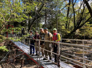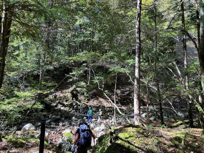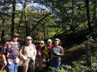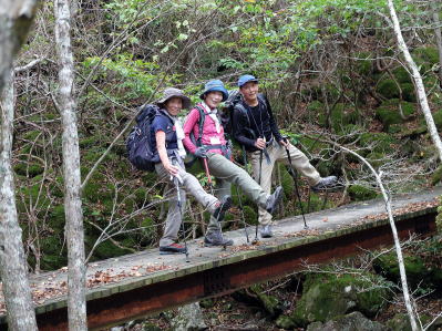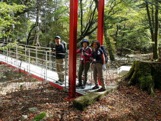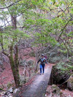 昼食後、2グループ分けて行動する。平坦な道を歩きワサビ谷とヤマト谷に架かる赤いつり橋を渡る。 第二の赤い橋も渡り、少しずつ登りになってくる。 たたら力水(看板がなければ見落とす)巨石と湧水を過ぎ 中ノ谷木橋。そこで写真を撮る。ナゴヤ谷木橋を渡り、登りが続いていく。出発時は快晴だったのに、山の天気は変わり易く、だんだんとガスが出始めた、 渓谷の川の音を聞きながら一歩一歩登る。チェックポイントで認定番号と名前の確認してもらい。 なだらかなのぼりを歩き西大台ケ原登山口の駐車場に帰る。