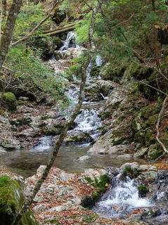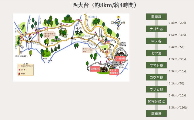 コースタイム(西大台ケ原) 西大台ケ原登山口8:20→チェックポイント場8:30→分岐8:40→ナゴヤ谷8:50→中ノ谷9:50→七ツ池10:09→ヤマト谷11:00→開拓跡11:20→コウヤ谷 昼食11:25〜11:55→赤いつり橋12:17→たたら力水(巨石と湧水)13:14→中ノ谷木橋13:32→ナゴヤ谷木橋14:05→チェックポイント場14:50→西大台ケ原登山口15:05
