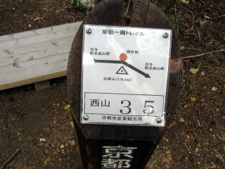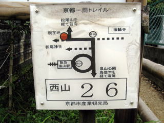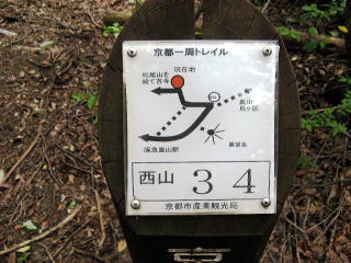 京都西一周トレイルの26の標識があり、そこから両側に孟宗竹の竹林がある石ころの多い道を登って行きました。竹林はよく手入れされていて「さぞや立派な筍が採れることだろう」と話しながら登って行きました。ここの竹は立派で美しかったですが、「あちこちの竹林に落書きなどがありいやだね」などと話しながら、筍掘りの難しさなどについての体験談もふれました。