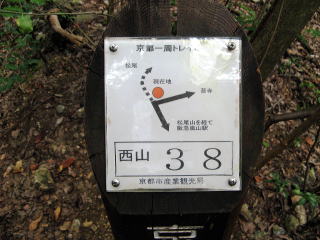 松尾山への分岐に差しかかり「下見の時は、34の標識を見落として保津峡まで行ってしまった」といい、左側の標識に注意して歩き35の松尾山のピークに無事達しました。そこから眼下に渡月橋が見えました。「ここから大文字はどれだけ見えるか」という話になり、渡月橋の向こうに「鳥居がみえる」、「東側の比叡山の南に左大文字がみえる」残念ながら右大文字や船形は見えないなどと話し、意外と皆さん双ヶ丘はご存じありませんでした。