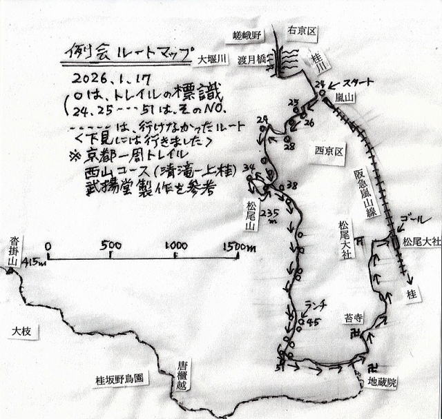 阪急嵐山駅 9時集合、9:10スタート→竹林→雑木→松尾山 10:30→地図の45 ランチ、12:40出発→雑木から竹林→西芳寺川源流→苔寺、鈴虫寺、松尾大社→阪急松尾大社駅 解散